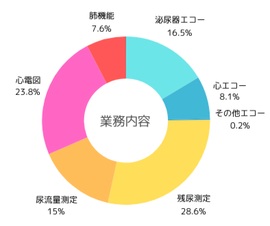 - 泌尿器領域の超音波検査や生理検査の他、手術前・透析患者の心電図・心エコー検査