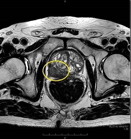 PSAが高値などの前立腺がんを疑う場合は、前立腺のMRI検査を行います。 前立腺MRIは、前立腺がんの診断に大変有用な検査で、前立腺がんの有無だけではなくがんの位置や大きさ、悪性度もある程度予測する事が可能となります。 また、疑わしい場所があった場合に行う前立腺生検の際、こちらの画像を前立腺生検の装置に取り込み、実際の超音波画像と融合する事により正確に前立腺がんと疑われる場所の組織を採取する事が出来ます。(MRI融合前立腺生検)