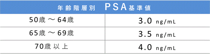 採血をして血液中のPSAという物質の量を測ることができます。 PSA(前立腺特異抗原)は前立腺から分泌(精液中に放出される)されている物質です。 正常な方の血液の中にもわずかに含まれていますが、前立腺に異常があると濃度が高くなります。 前立腺癌がある場合も鋭敏に数値が上がるため、癌をチェックする有効な指標として使われています。 PSA基準値は一般的に年齢を問わず1mL中に4.0ng以下であれば正常とされますが、次の表のような年齢階層別のPSA基準値を用いてもいます。
